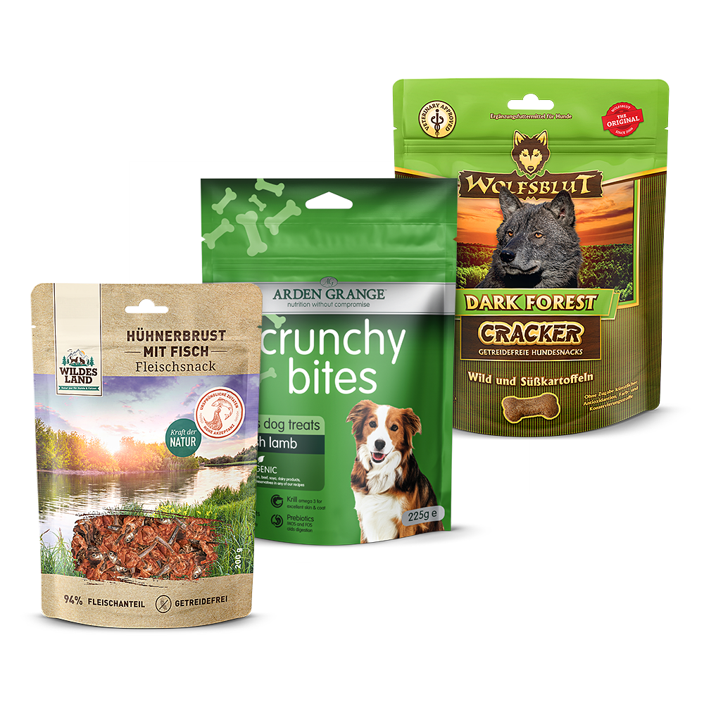 GRATISZUGABE* *Voucher SNACK99 im Warenkorb einlösen, das Produkt muss sich im Warenkorb befinden. Einlösbar auf alles. Nicht mit anderen Gutscheinen oder Angeboten kombinierbar. Einlösbar ab einem Mindestbestellwert von 99 EUR (exkl. Gratiszugabe). 1. Snack Wolfsblut Cracker: Wolfsblut – Hundekekse – Dark Forest Cracker (getreidefrei) Die zucker- und getreidefreien Dark Forest Cracker sind eine ideale Ergänzung zu dem Futter von Wolfsblut und bieten Ihnen die Möglichkeit Ihren Hund gesund zu belohnen und auch unterwegs einen kleinen Snack anzubieten. Die Wolfsblut Hundekekse Dark Forest Cracker enthalten nur das Beste: Ein hoher Anteil an feinem Wildfleisch (32%) in Lebensmittelqualität sorgt für einen hohen Anteil an Proteinen, wichtigen Mineralstoffen und Vitaminen der B-Gruppe. Außerdem sorgt Spirulina für eine Stärkung des Immunsystems, Süßkartoffeln stellen viele wichtige Nährstoffe bereit, Brennnessel stärkt die Abwehrkräfte, Weißdorn unterstützt die Leistungsfähigkeit des Herzens, Löwenzahn regt die Leberfunktion an und Ginseng steigert die Vitalität. Die Hundekekse Dark Forest Cracker von Wolfsblut sind garantiert frei von Farb-, Duft-, Füll-, Lock-, oder Konservierungsstoffen und chemischen Antioxidantien und eignen sich auch für ideal für allergieanfällige Vierbeiner. 2. Snack Wildes Land Fleischsnack: Wildes Land Hühnerbrust mit Fisch Der Wildes Land Fleischsnack Hühnerbrust mit Fisch basiert auf der Ursprünglichkeit und Kraft der Natur. Mageres Hühnerbrustfilet wird um feine, kleine Fische gewickelt und schonend luftgetrocknet. Der fleischige Snack erfreut sich dadurch sowohl bei Hunden als auch Katzen einer ausgezeichneten Akzeptanz und Verträglichkeit. Dieser getreidefreie Snack von Wildes Land eignet sich damit ideal als artgerechte Belohnung für Ihren Hund oder Ihre Katze und gibt Ihnen die Möglichkeit, die innige Beziehung zwischen Mensch und Tier weiter zu stärken. 3. Snack Arden Grange Crunchy Bites : Arden Grange Crunchy Bites mit frischem Lamm Die Tasty Crunchy Bites von Arden Grange sind die perfekte Belohnung im Training oder einfach für Zwischendurch. Gut drauf und Gutes drin: die Tasty Crunchy Bites stecken voller nahrhafter Zutaten und Geschmack. Alle Rezepturen enthalten gelenkunterstützende Inhaltsstoffe, Traubenkernextrakt mit Antioxidantien und Grüntee-Extrakt. Durch die Verwendung eines Monoproteins können die Leckerli auch ideal für Allergiker verwendet werden. Die Zusätze, auf die Arden Grange setzt sind natürlichen Ursprungs und können den Organismus Ihres Lieblings unterstützen.